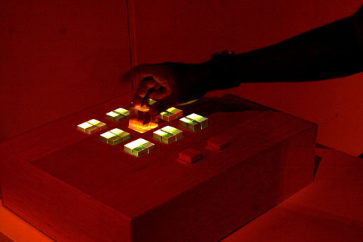 The user can place the acrylic cube into any 9 slots situated on Plexi-Pixel to start creating an dot-patterned animation. Upon creating a desirable frame for the animation, the user can hit the "record" button to record that frame and continue on creating more frames to complete the animation.