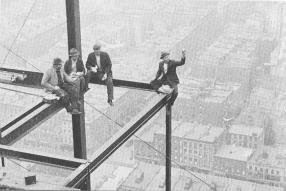 These constuction workers put their lives on line for a few minutes to take a lunch break. Boston, 1933.